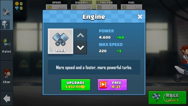 登山赛车中吉普车是新手送的,这款车性能很渣。用它一遍一遍的跑田园地图或者你受不了了直接下载无限金币版吧,直到攒够金币买下一辆车,就是越野摩托车了,越野摩托车的性能各种狂飙,足够玩儿很长一阵子了。