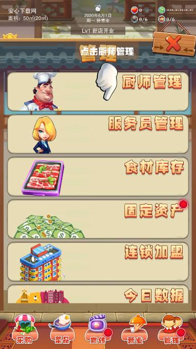 3、调集各种特色锅底、固定资产的办理、食材库存的办理、连锁经营店等特色玩法等,由玩家自由摸索。