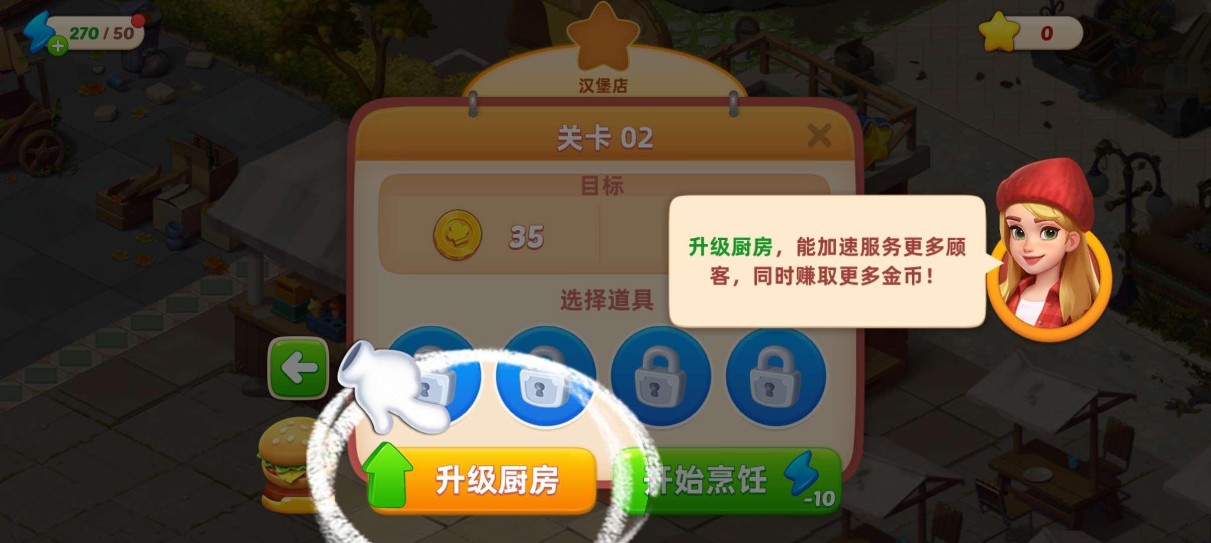 -手指点击屏幕,升级你的大厨、菜品、餐厅装修、上菜速度等等,即可赚更多金币。存够足够多的金币,就可以开下一家新餐厅,接受下一关卡的新挑战啦。