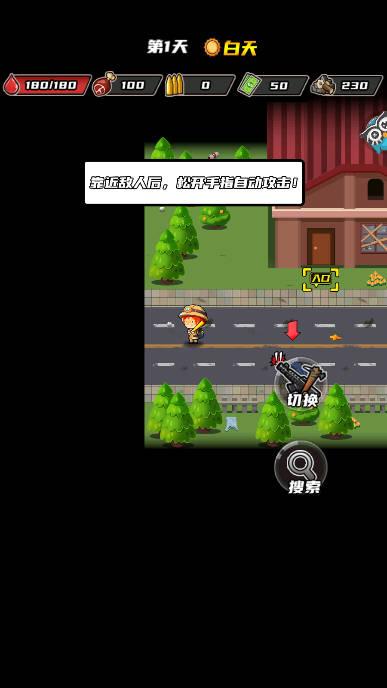 1、滑动屏幕操控人物移动,靠近僵尸会自动发起攻击。