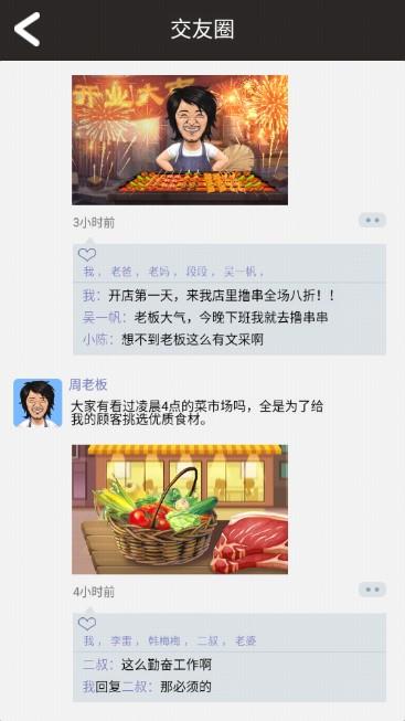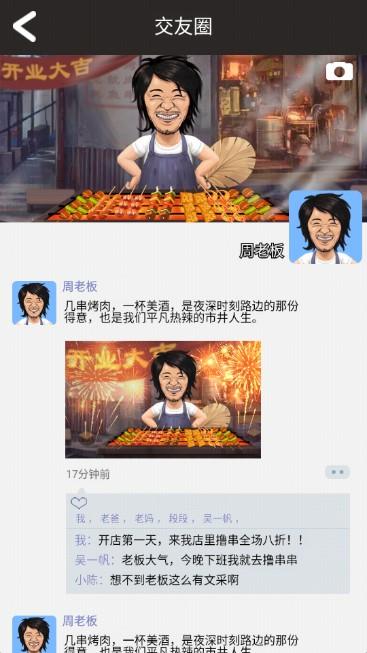 2.游戏中加入了一个交友圈功能,里面有老板的朋友圈状态,点赞的人非常多,有老妈老婆,啤酒妹,还有等等叫不上名字的人,人数非常多,但就不知道和老板,到底是啥关系,也没有一些剧情的铺垫,按道理,除了家人以外的人可能都是顾客,但是玩了20分钟店都开了两家,还是没有出现和顾客交流的玩法,个人认为可能是制作的时候想要添加老板和顾客交流剧情,是因为其他种种原因没有加入到游戏中,玩法或者是在后期有这个可能性不大,至少这方面我觉得还有更好提升空间,当老板不需要自己动手烤串的时候,可以增加和顾客的互动,然后平时发朋友圈也会点赞,可以看看顾客们的朋友圈,这样的话,互动性会更强,也符合游戏介绍里面的体验人生设定,如果这方面能做得更好的话,游戏也是可以得到四颗星,参考昭和游戏系列。