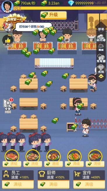 3.游戏的节奏感还是不错的,虽然是一个简单的挂机升级类型游戏,但是在游戏中也可以享受一下做烤串老板的乐趣,看着服务员上菜,厨师烤串,收收钱也能有一丝的成就感,随着不断开新店,也很符合一个经营模拟游戏的设定,只是这方面的玩法偏弱,用来打发时间还可以,往深里玩也没什么意思。