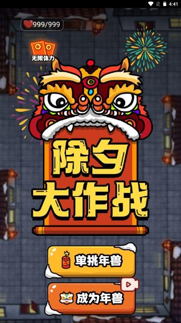 除夕大作战免广告无限金币加强版是抖音同款手游除夕大作战,是一个躺平发育类型的游戏,游戏玩法也很简单,就是和躺平发育一样,在房间中躺平获取金币,金币用于建造建筑然后击败年兽,这个版本还可以当做年兽与其他人一起游玩,解锁免广告获取奖励。