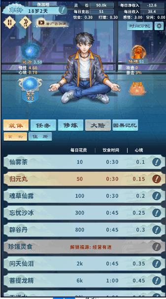 前期怎么玩:前面主要搞钱,钱搞到600k左右就差不多可以靠投资了,人力就分配9小时打坐,其他可以考虑全部给修炼。
