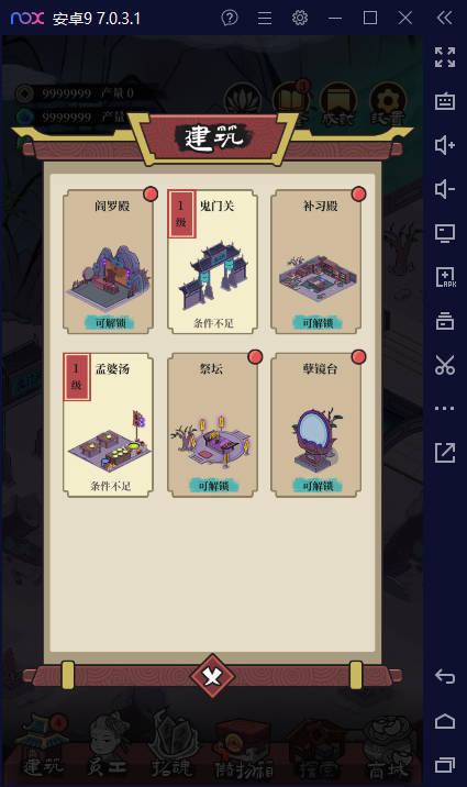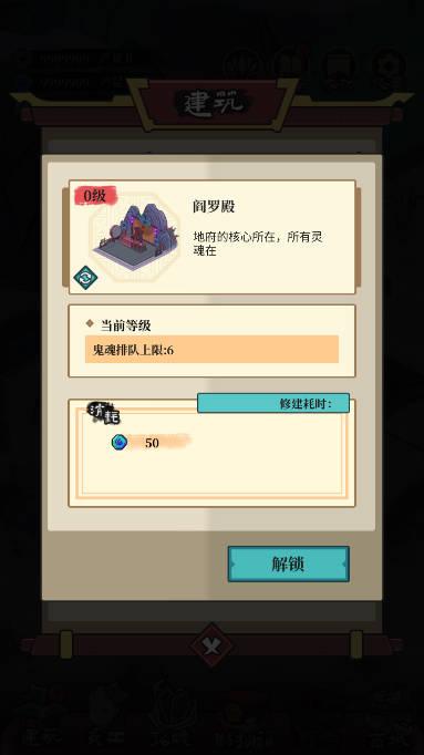 2、之后在这里我们就能看到鬼门关所有的修建,解锁或晋级他们,将为你带来异乎寻常的放置模仿体验!