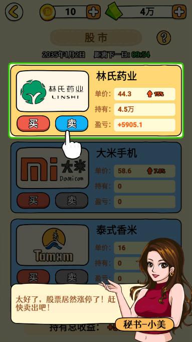这是一个动画风格的炒股赚钱模拟人生的游戏,在这个游戏里面玩家获得股神的投资,然后从小人物不断地炒股赚钱成为大富翁,非常真实的体验和玩法,不用看广告就可以解锁奖励!