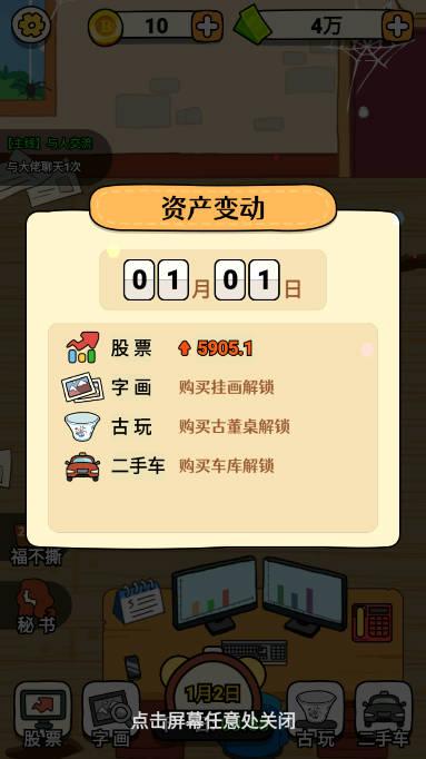 在游戏中富家致富是一种什么体验,一步步的通过自己的努力,经营店铺,从平平无奇的打工人变身顶级富豪,不用再担心钱的问题,随便买买买,还能购买豪车豪宅,和美女约会,拍卖展览等等,建立强大的商业版图,学会炒股,成为炒股大亨,卡通的画风,玩起来很有意思!