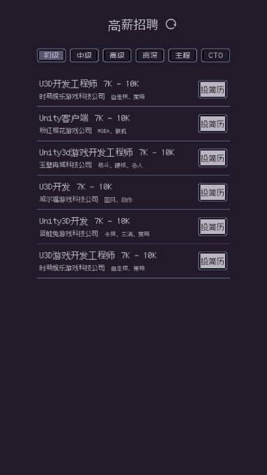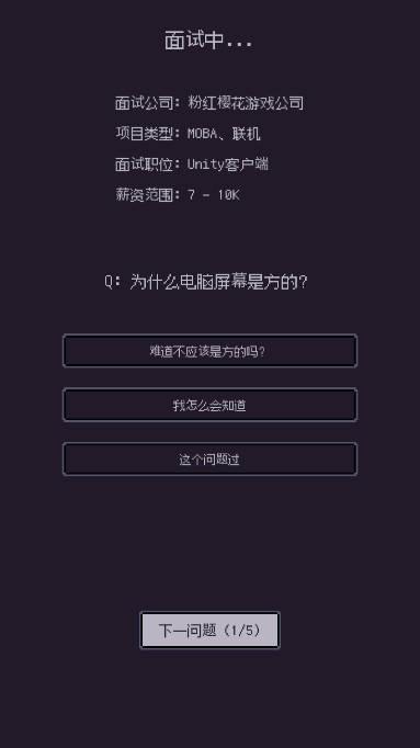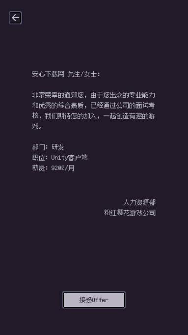 游戏开始需求完善简历信息,然后挑选中意的公司进行投递和面试,拿到Offer后,不同的公司,给出的薪资略有差距,需求仔细考虑。