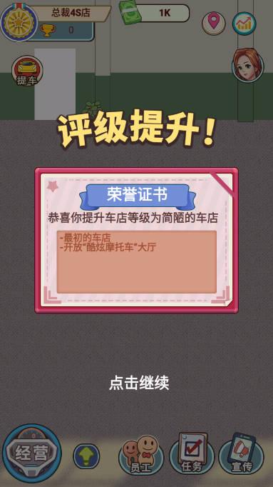 这是一个放置模拟休闲玩法的经营游戏,玩家成为了4s店的老板,你要从摩托车开始卖起,不断地积累自己的财富,非常真实的玩法和体验,不断地赚钱,最后扩大你的店铺!