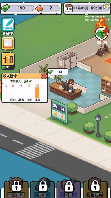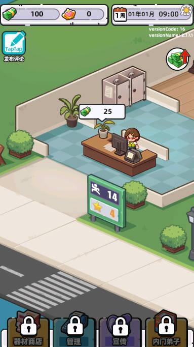 这是一个简单休闲经营模拟类型游戏,玩家成为了一个武馆的老板,你需要做的就是不断地经营自己的武馆,吸引更多的学生来学武术,不断地获得更多的收入来装修扩大自己的武馆!