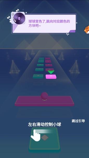 玩家只需要指尖轻轻左右滑动跟随音乐节奏使音乐球球落到与球球颜色对应的色块上,以完成整首歌的闯关。