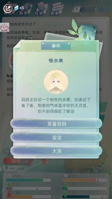 情商、道德:主要数值为出生时的随机值,游戏前期只能通过事件能带来数值变化,到达一定年龄后可以通过学校活动、活动界面的一部分内容进行增加。