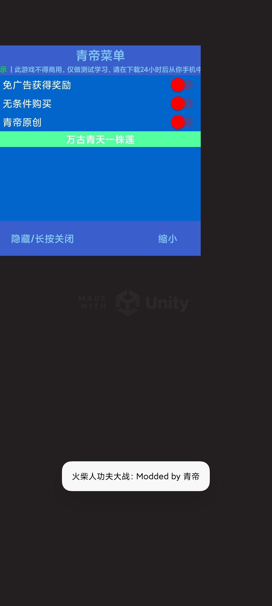 火柴人功夫大战内置青帝MOD菜单版(com.szyy.hcrgfdz)是青帝MOD一款武侠精品小游戏,这个游戏是一款文字类型的武侠单机手游,还自带有肉鸽的元素,各种精品好游戏可以给你带来各种各样的游戏体验,游戏解锁青帝菜单,免广告获取奖励,无条件购买任何物品。