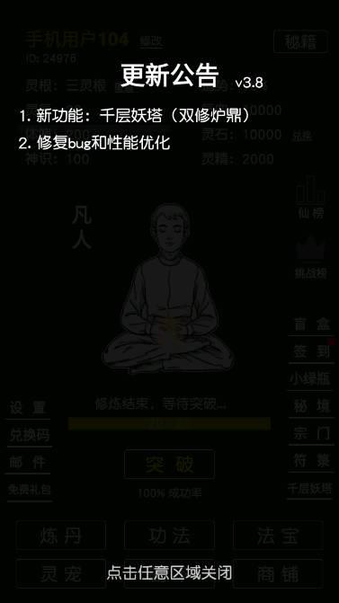 可以增加灵气快速提升修为,也可以用来突破修为,当然多余的丹药还可以在商铺出售换取灵石灵精,而炼丹就是获取丹药的唯一途径。炼丹并非100%成功,丹药的数目受成丹率影响,成丹率越高炼制丹药时损耗就越少,炼丹等级越高成丹率越高(炼丹等级受熟练度直接关联,炼制成功或者失败都可增加熟练度),额外的丹炉也可也增加成丹率(丹炉可叠加)。炼制前需要从商铺购买丹方以及所需的炼丹材料,副本及秘境也可以产出大量材料。