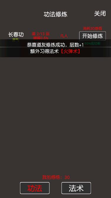 修炼灵气类功法可大大增加修炼速度,该类功法层数越高修炼速度越快,具体见功法篇。修为可以额外辅助加速,打坐期间使用特定丹药可直接增加灵气值达到临界值,突破时也可以服用突破类丹药增加突破成功率,当然能重置到天灵根修炼起来就更快了,另外升级小绿瓶也可以大大增加修炼速度。
