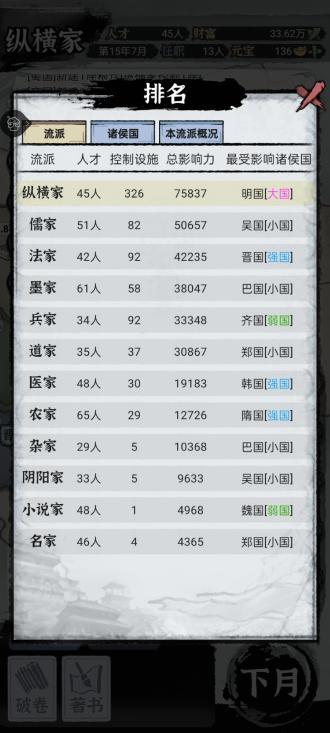 进入游戏后玩家可以选择诸子百家中最为著名的12个派系的其中一个,并且成为派系首领,游戏以春秋战国时期的历史为主,地图上也分布着各个势力的领地,玩家要做的则是在各个领地内扩充派系人员,并且找机会增加影响力,担任国家内部的官职,慢慢渗透到整个朝廷,从而来获得更多控制的权力。当然这些都是分支玩法,更多的还是以培养派系成员为主,其实本质上的玩法和市面上那些修真门派游戏一样,都是以培养弟子为主,我们要做的就是培养更多强力的成员,在之后各个城市对各派系招募官职时送进去,然后所得到的利益分一部分给派系罢了。除此之外,玩家在每月内还可以做出一些随机任务选择,如两方国家开展,玩家身为派系首领可以选择帮助进攻方或是防守方,胜利或失败都能增加或减少指定国家的各方面数值影响,也会增加我们派系的影响力。