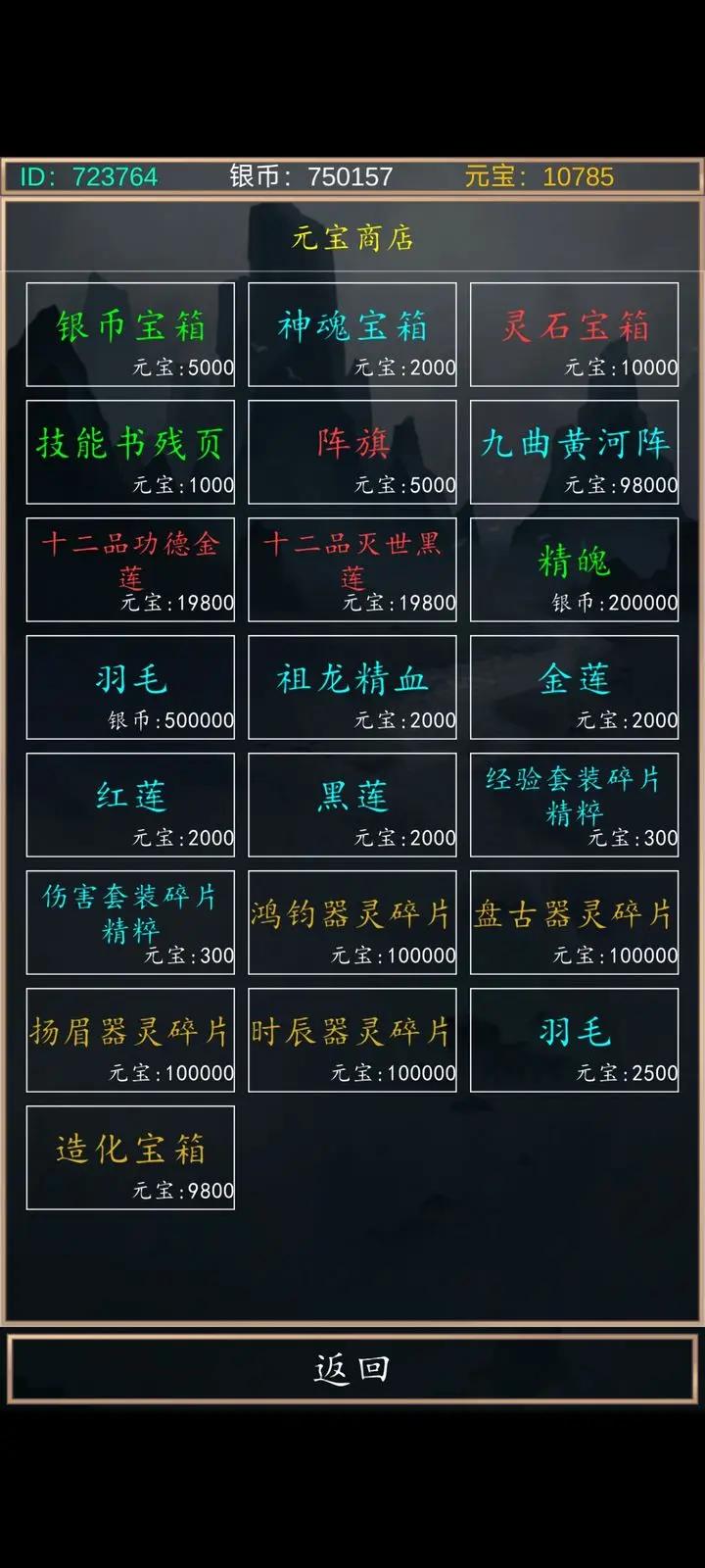 总结:挂机就行了。这个游戏资源挺少的,元宝是最重要的。只买伤害套,阵法,经验套,加商城10万元宝的套装。其他都没必要碰。
