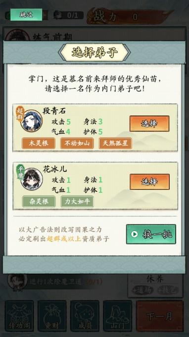 首先在游戏的玩法上,玩家需要作为一个仙侠宗门的领导者,招收资质上乘的弟子培养,并且对这些弟子进考核通过一系列的试炼从而 让弟子从最初级的段位一步一步提升至亲传乃至护法的地位,从而使得宗门的实力得到增长,不过这款游戏的资源肝度属实有些过高,培养弟子和宗门的资源所需的数量和通过日常任务以及肝度获得的资源数量,完全不能匹配,使得游戏在中后期进程十分缓慢,这使得玩家在游戏后期的游戏粘性大幅下降甚至被劝退,不过游戏内的一些创造性的设定还是比较好的,比如玩家可以通过征服其他实力比自己低的宗门从而获取他们的资源和人力。甚至还可以获取道侣,这种新奇的设定还是使得玩家眼前一亮,还是可以很好的提高玩家的游戏趣味性的,不过和其他修仙类游戏的通病一样,游戏发展到中期之后明显感觉到玩法的单一和乏味,并且游戏内的挂机机制还十分拉胯,缺乏更多创造性的玩法属实让玩家后续的游戏体验有所下降,其次游戏内的广告机制的设置极其不合理,主要表现在广告的数量上实在太过于多了点。