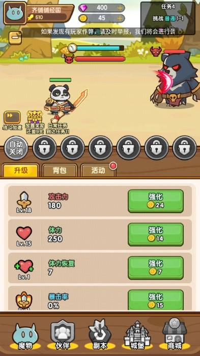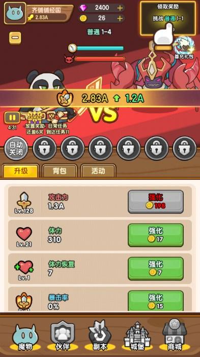 目前来说,作品的玩法唯一的有趣点就在于它有一个非常明显的节奏晋升,比如说玩家需要在不同的时期,对自己的属性进行不同的提升,从而使自己自身的属性得到好的提升,更容易面对后续的关卡,这是一个比较有有趣性的创作,但可惜的就是它的内容离不开核心的挂机和放置的玩法,而游玩的过程也只是需要去一直等待,等待放置所带来的资源收入,之后再将这样的资源投到升级之中,用来更好的应对放置的内容,只能说这样的创作确实没什么内容,而且很容易失去可玩性,虽然前期能够利用一些外在化的包装来提升玩家的游戏体验,但是等离了新鲜感的创作之后,作品的短板就会暴露出来,在后续的创作中需要做的就是补充玩家的参与感,以此来提高游戏的可玩性。