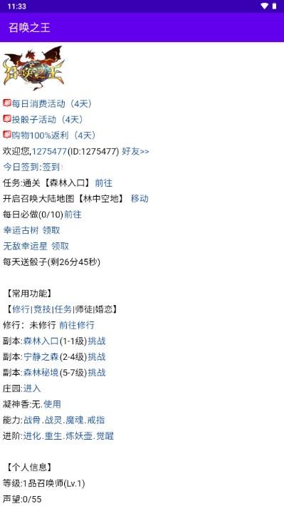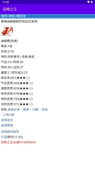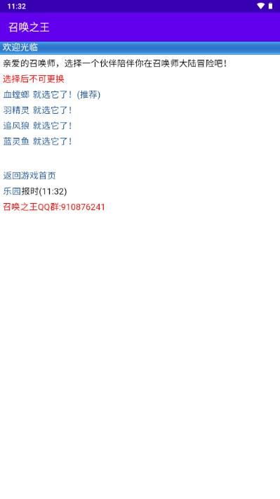 这是一款上古时代非常流行的,诺基亚时代曾火爆全国的宠物养成类WAP文字游戏。在召唤之王中,你可以培养宠物,兽族,虫族,羽族,水族,属性各异,技能众多,玩法有趣。