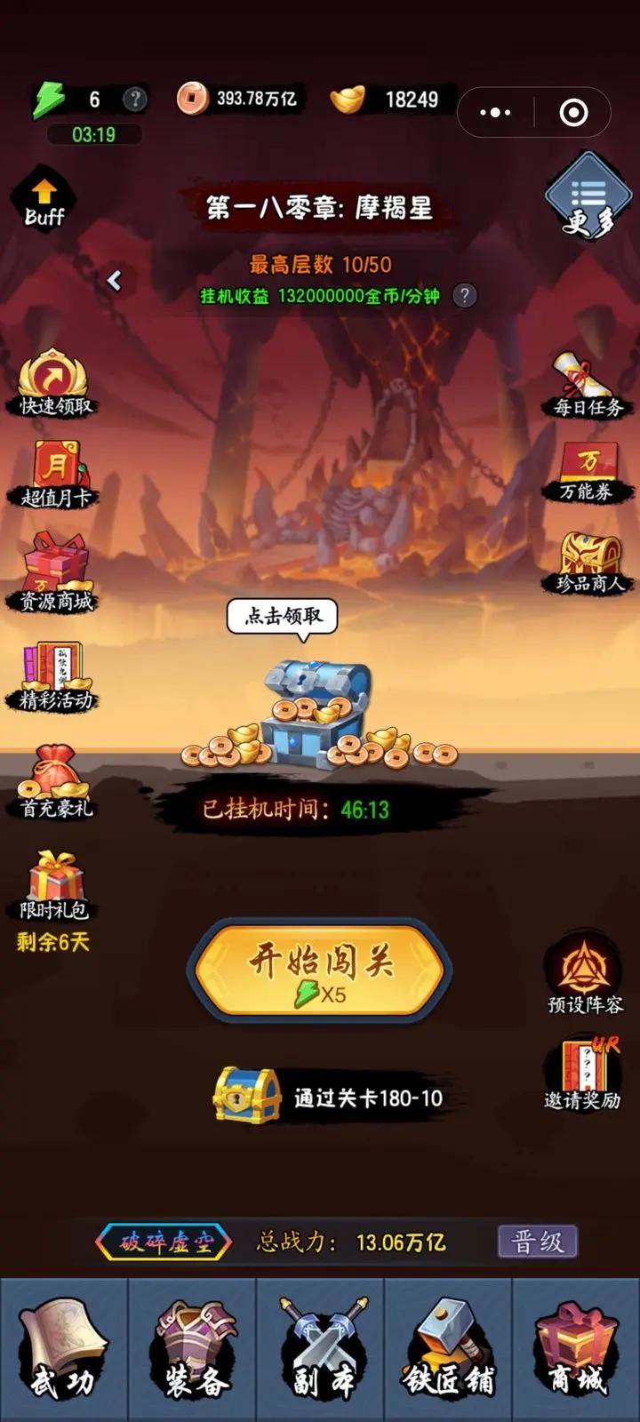 玩了半年多,现在180关,带6土套有16万亿战斗力,前期充了3000块,现在没充了,月卡啥的都停了有两个月了