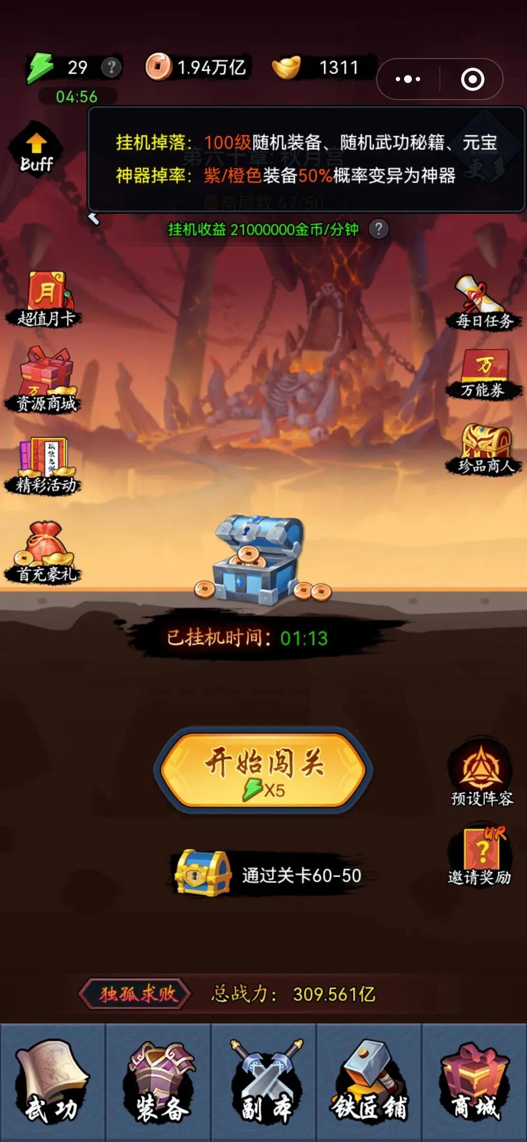 给没玩过的讲一下为什么恶心,因为最后一关要把战力从一亿提升刀50亿,而武功书是完全加不上战力的,只有靠着丹药的翻倍才有可能加上,但丹药具有不稳定性,可能会翻倍失败,,所以想要搞这个联动皮肤就只能氪,氪礼包,关键是氪了这个98礼包都不一定能过关,绿色丹药也有概率会掉星(而且概率很大)总而言之就是,过关很难,非常难