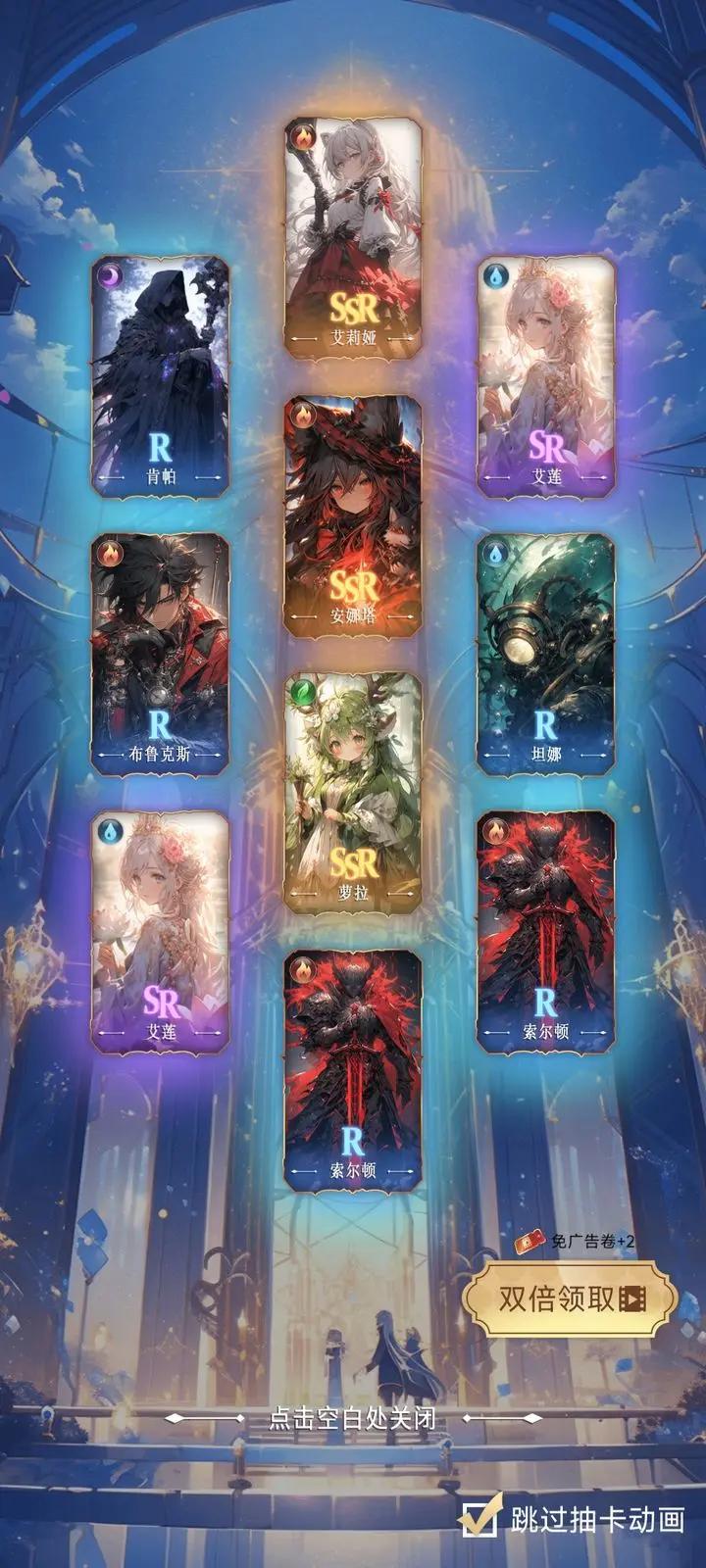 玩了10个小时左右,所有SSR都白金+30星以上了,确实作为抽卡类游戏,广告代替氪金后钻石完全花不完,十连还可以看广告双倍,感觉已经不再想碰其他类似的游戏了。