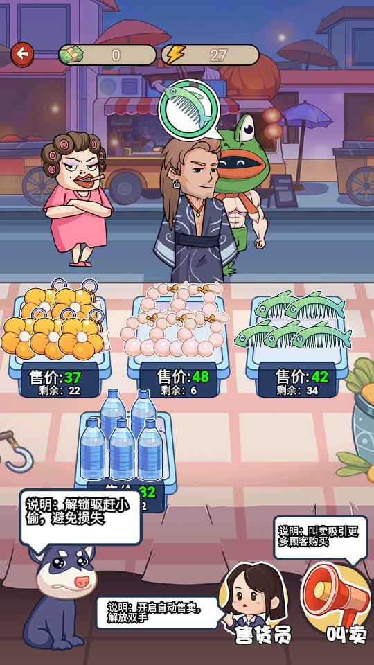2.摆摊玩法:先进货-摆摊,场景中有NPC走过会购买物品。卖掉的商品会获得金钱。