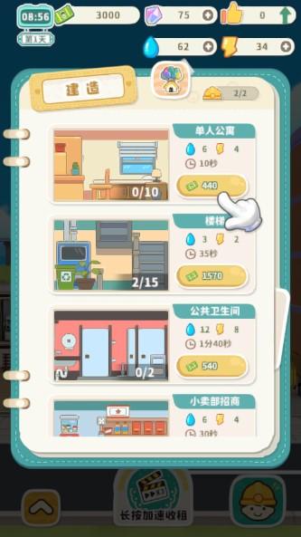 你需要规划扩建大楼,租出更多的公寓与商铺。配置家具升级房间可以租出更好的价钱,不过小心租金太贵吓跑租客哦!要谨慎挑选招租的商铺,只有满足了居民生活需求的商铺才会赚大钱,不然就等着商铺老板破产找你哭穷喽!