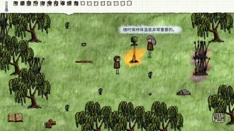 在游戏中屏幕右下方是温暖指示,箭头指示当前的体温程度,中点代表最佳温度。太热或太冷本身并不危险,但饥饿度下降速度将显著提升,影响体温的周遭环境因素有很多,包括服装、火堆、所处环境和建筑物。