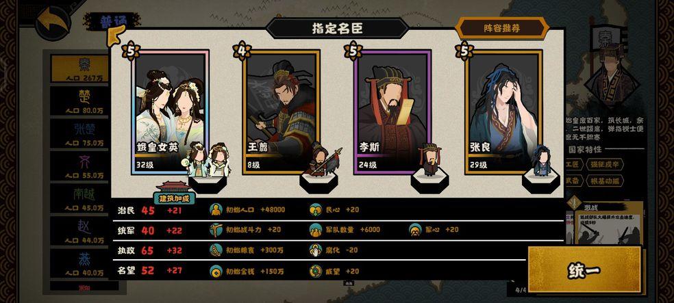 政治:商鞅(降低腐化触发离骚,抢夺军心,增加50战力)/李斯(提高1科技+25%规模)