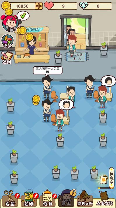 这是一款经营美发沙龙的游戏,在这里,你可以雇佣Tony老师为顾客打造时尚造型,杀马特爆炸头、渣女大波浪、可爱啾啾头.....各种发型等你开发!随着规模增大,你还可以开启【浴足】、【美容护肤】、【水疗泡澡】、【脱发治疗】模块,打造一条龙服务!