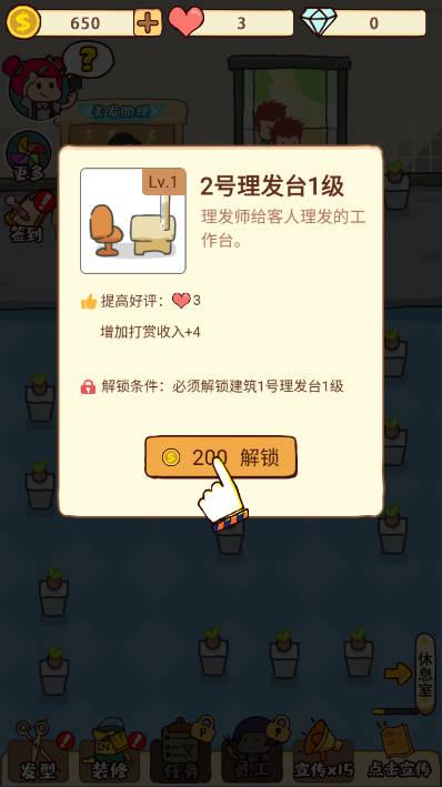 而且游戏在客人多的时候是会感觉到一点手忙脚乱的,可是原本这款游戏应该是定义为休闲游戏,但是从游戏整体的感觉上来看,却并没有那么休闲的感觉,基本上在客人一来便要进行安排剪发,然后在其他客人剪完发之后,必须还得马上去收集硬币,并没有那种可以自动收集的工具,而且在前期很多都是人手不足的情况,白白缺失了很大批的用户群体,前期所设置的一些建筑的金额较高,而顾客所能提供的资金又比较紧凑,所以这方面我个人觉得设置也是非常的不合理。