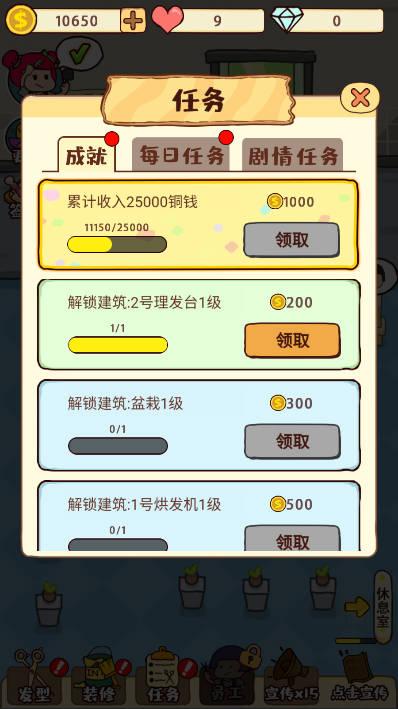 理发的流程,基本就是搞搞发型,解锁下游戏发型的游戏操作。说经营有那么点内容,说理发的话,没太表现出不正经理发的那种感受。