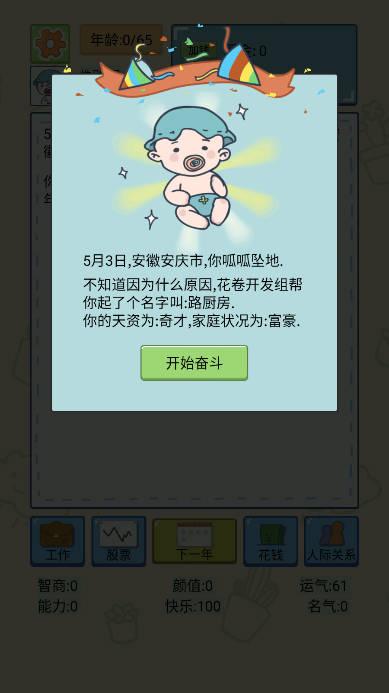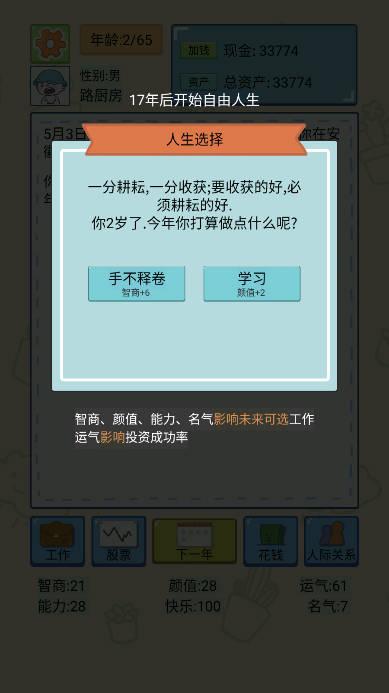 模拟创业人生游戏是一款模拟人生类经营游戏,在里面你可以从头开始扮演一个角色,选择不同的生活来度过一生,各种各样的职业都可以自由的选择体验,充满中国特色的趣味玩法带你感受各种不同类型的人生,无论是从商还是从政,当小人物还是大人物都可以根据自己的努力来达成。