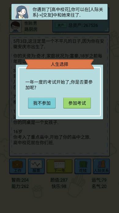 生活事件与决策:游戏中会随机生成各种生活事件,如家庭变故、经济危机、政治风波等。玩家需要根据自己的角色定位和生活目标,做出明智的决策来应对这些事件,从而影响自己的人生轨迹。