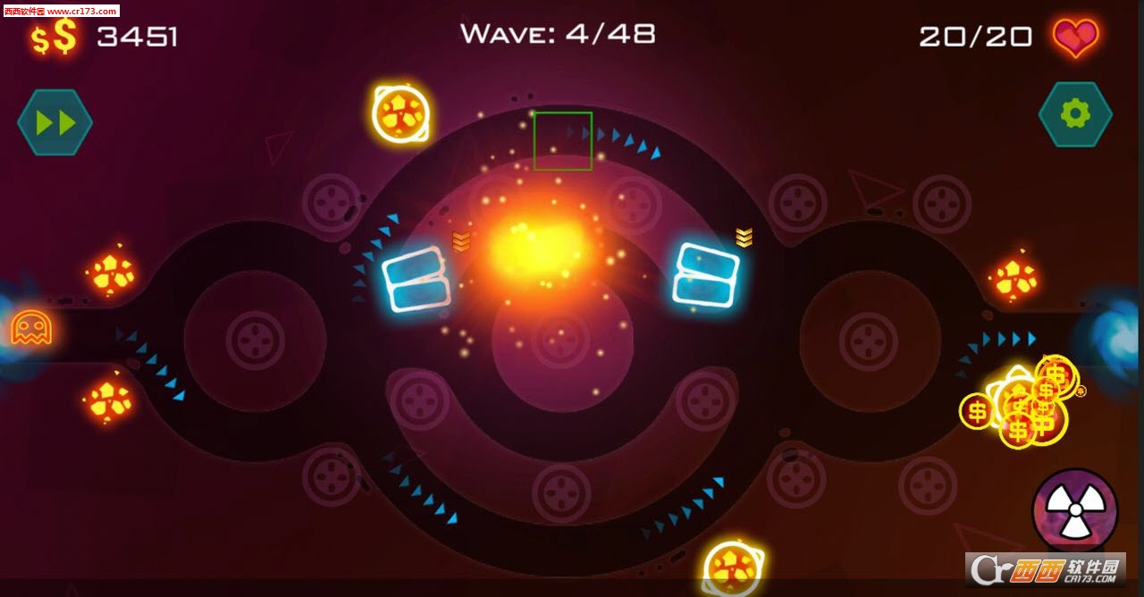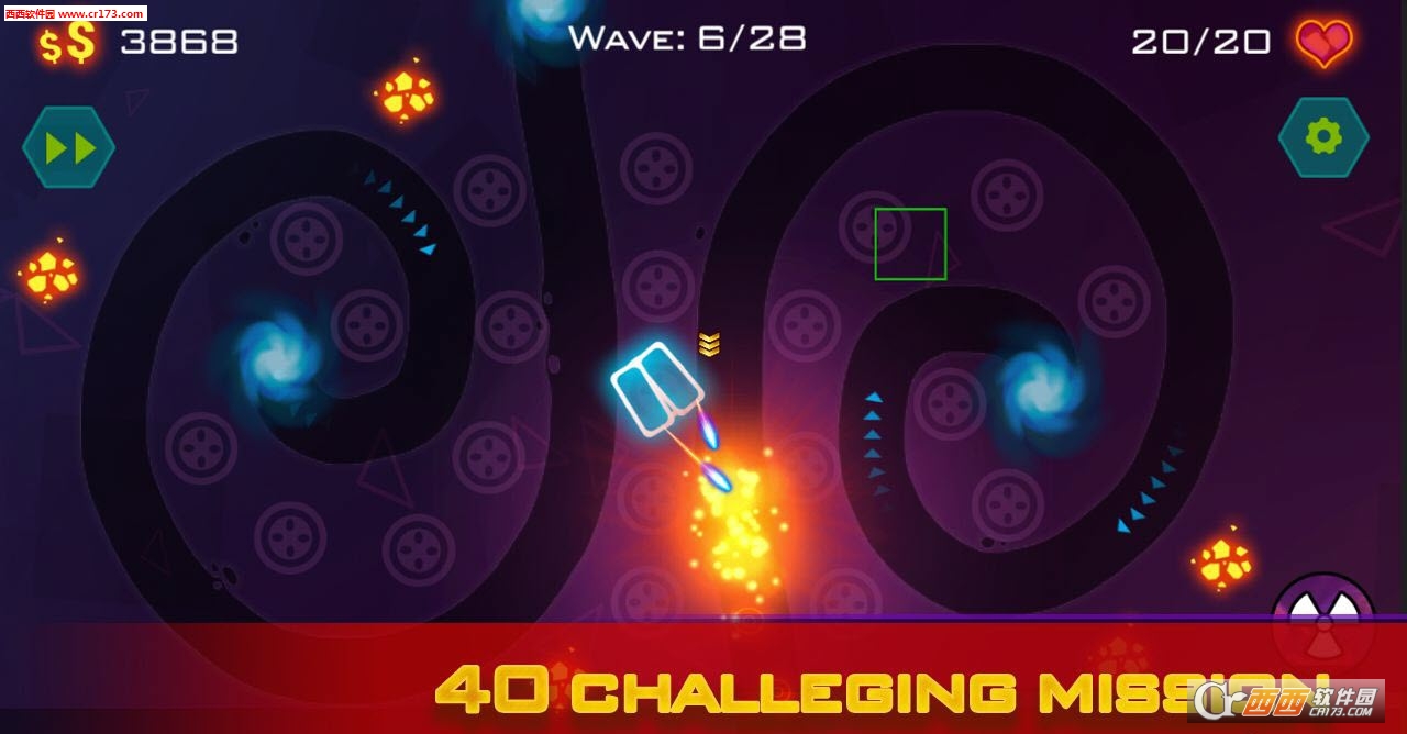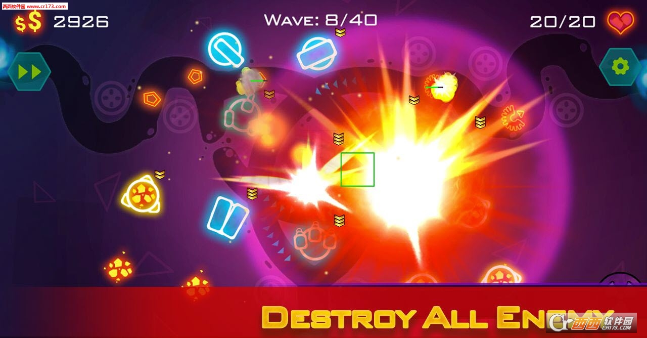 塔防几何战争安卓版一款以简单图形为主要元素的塔防类游戏。游戏最大的特色就是简洁,没有多余的东西,炮台和敌人都以最简单的几何图形勾勒而成。然而游戏内容却很丰满。