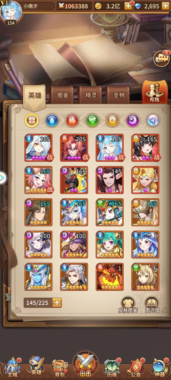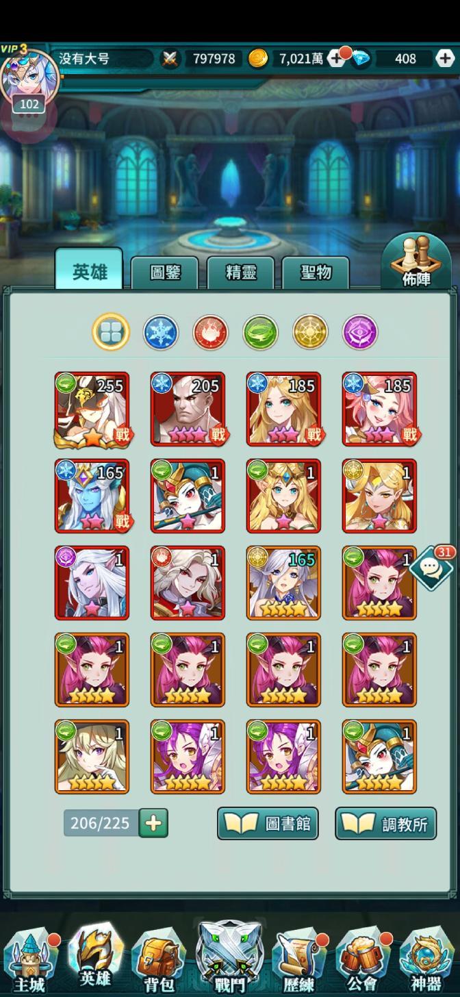 现在阵容强度一般,主要是刚开始玩没方向,升级才是重要的事情。阵容一开始还算好,五个九星的时候有黑暗领主,瓦妹,白虎,麦萨尔,还有一个就是阿努比斯了,但是后来不知道怎么想的,因为光暗系的英雄除了不能升十星的都不好抽到,于是我等不了了,刚好攒了很多风王,白虎给了风王,一下就十星了,瓦妹喂给了梅林(最大最大败笔),白虎暗主给了凤凰,阿努比斯也给了潘多拉(唯一辅助)。