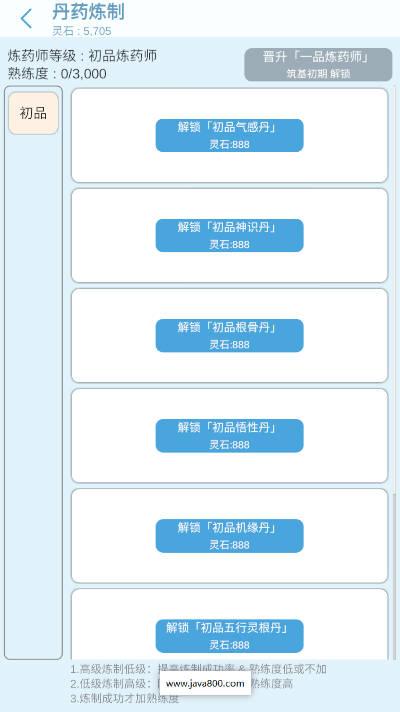 ③.游戏整体还是以放置为主,毕竟它是这种单机的文字游戏,可能大部分时候都是需要挂机来获得一些资源,比如我们玩家的升级和一些炼制的丹药都是需要玩家去自己炼制,而且在游戏中丹药的一个存在感和用处还是比较广的,不仅能帮助我们突破瓶颈,有时候战斗也可以带来很大的效益。
