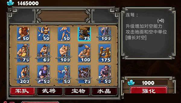 初期使用水晶也要注意,水晶要积攒。好钢用在刀刃上,那么后期就会好打一点,刚开始不要把水晶花在没多大用途的上面(比如解锁兵种,像投石器、闪电法师、僧人……就不建议解锁,装备直接买最好的)。铁锤兵优先解锁,对付地面就靠他玩,空中靠弩车。当然这两个兵种也要优先用水晶升级(兵升级不如武器升重要,所以,冰女、鼓手、黄金矿工……其次升级),考虑。