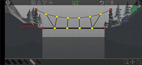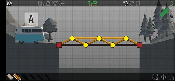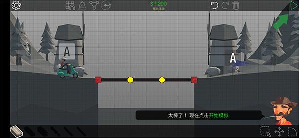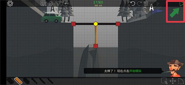 1、进入游戏后,玩家可以根据系统提示来完成建造,建造完成后可以点击右上角开始按键来模拟建造完成的桥梁