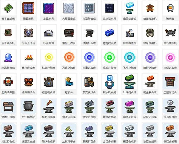 泰拉瑞亚合成表分为水合成、织布机合成、工作台合成等多种合成方式,玩家可以根据自己的需要来合成相应的物品,每中物品合成时所需的材料和消耗的内容都有详细的说明。