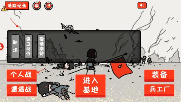 1、打开游戏,会发现中间有一个按钮,点击“开始游戏”。进入到游戏主界面后,会看到个人战、遭遇战、进入基地、装备、兵工厂这几个功能按钮,选择个人战,上面会显示“靶场”、“保卫河谷”等战争。