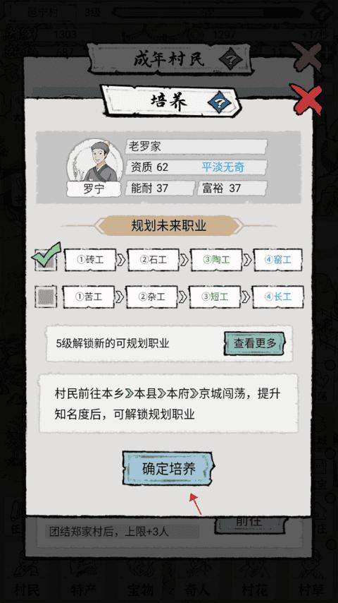 2、你会看到村民的具体信息,像能耐、富裕、资质以及未来职业规划等,村民前往本乡>本县>本府>京城闯荡,提升知名度后,可解锁规划职业,点击确定培养。