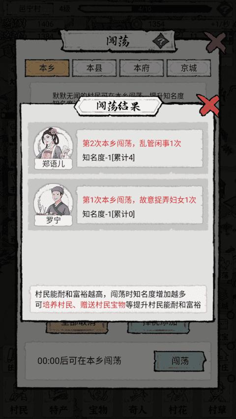 4、当村民在本乡闯荡一番之后,就会显示知名度是否添加还是减少,同时还会告知知名度减少的原因。