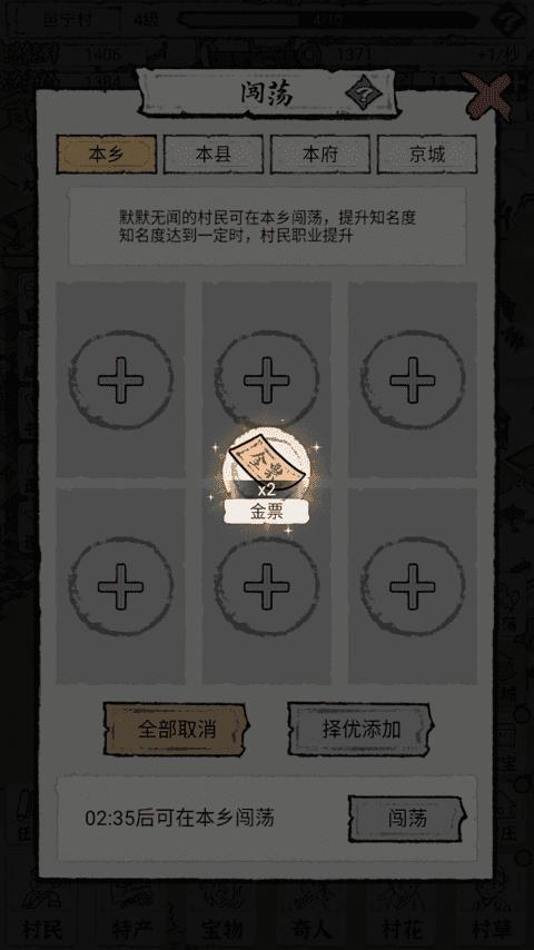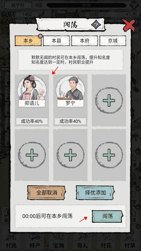 3、如果想提升村民的资质,还需要提升他自己的知名度,先按下“择优添加”将村民添加进来,然后点击闯荡。