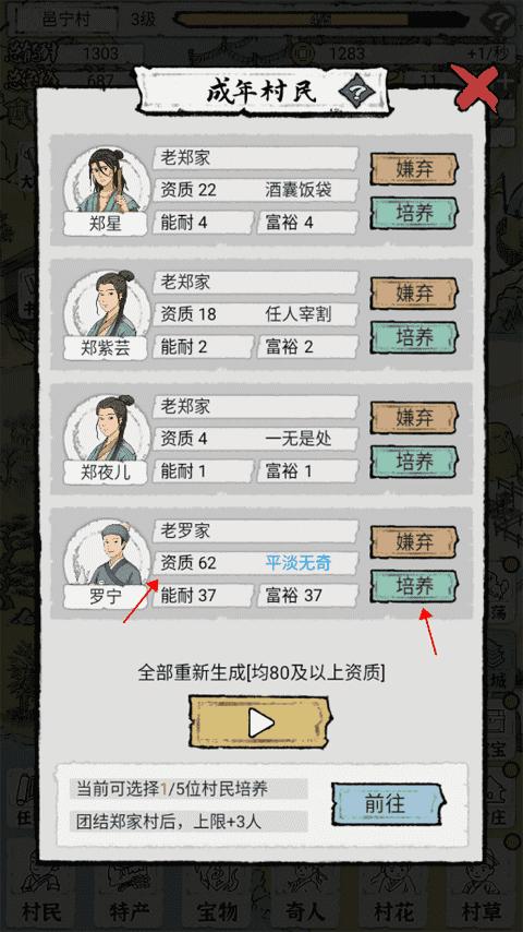 1、打开游戏,点击“成年村民”区域,在这里你可以看到很多资质不错的村民,选择其中一个进行培养,如果觉得资质太差,也可以点击下方的按钮观看广告,提升村民的资质,选好村民后点击“培养”。
