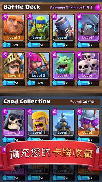 收集并升级数十张卡牌,其中有您熟悉并喜爱的《部落冲突》中的部队、法术和防御工事,以及多位皇室成员,如王子、骑士和飞龙宝宝等等。攻打敌军国王和塔楼上的公主们,击败对手并赢取奖杯、皇冠以及竞技场荣耀。组建部落,分享卡牌,打造属于自己的战斗圈子。