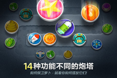 保卫萝卜:48个关卡,3套精美的主题包,从天际到丛林,再到沙漠!14种风格独特的防御塔,“潮”得可爱!创意,萌系,引领塔防新潮流!
