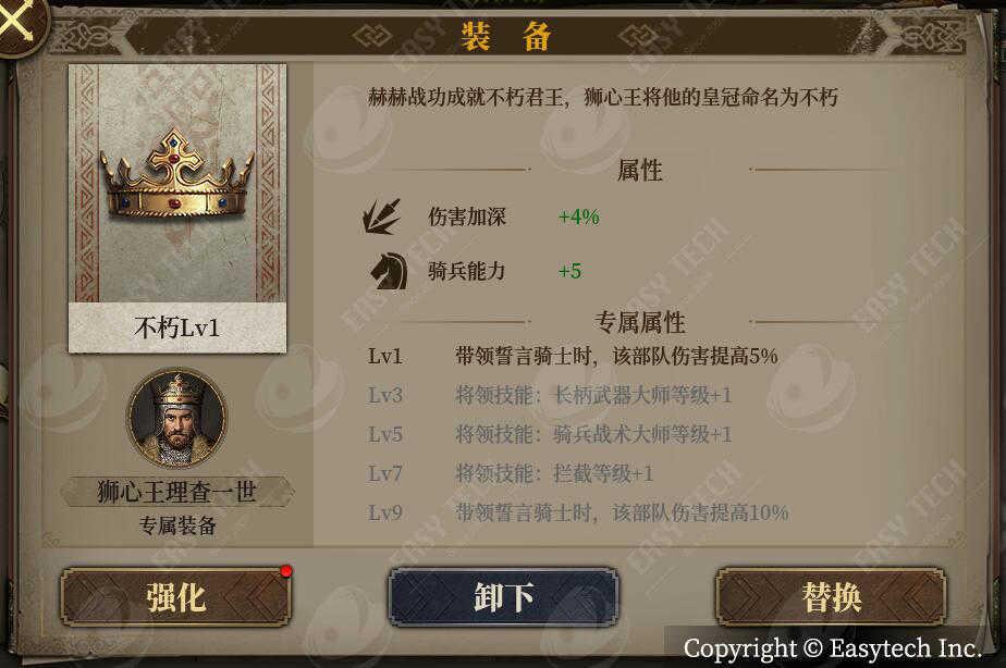 将领通过升级军衔,可以获得能力点数来强化将领的各个属性(可重置),和解锁新的技能槽和士兵槽。传奇将领可通过升级爵位,来提高部队伤害和减伤效果。并且传奇将领都有与其对应的英雄传奇章节和专属装备,专属装备可以加成专属兵种和技能。